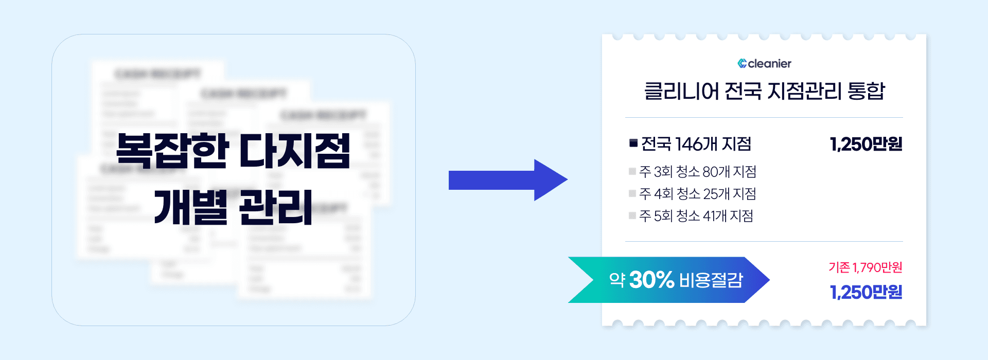 다지점 통합 계약을 통해 각 지점을 개별적으로 관리하는 것보다 훨씬 경제적으로 청소할 수 있습니다. 통합 관리로 불필요한 비용을 줄이고, 더 나은 예산 활용을 도와드립니다. 비용 절감과 동시에 편리한 관리 방법, 클리니어가 제안합니다. 💡