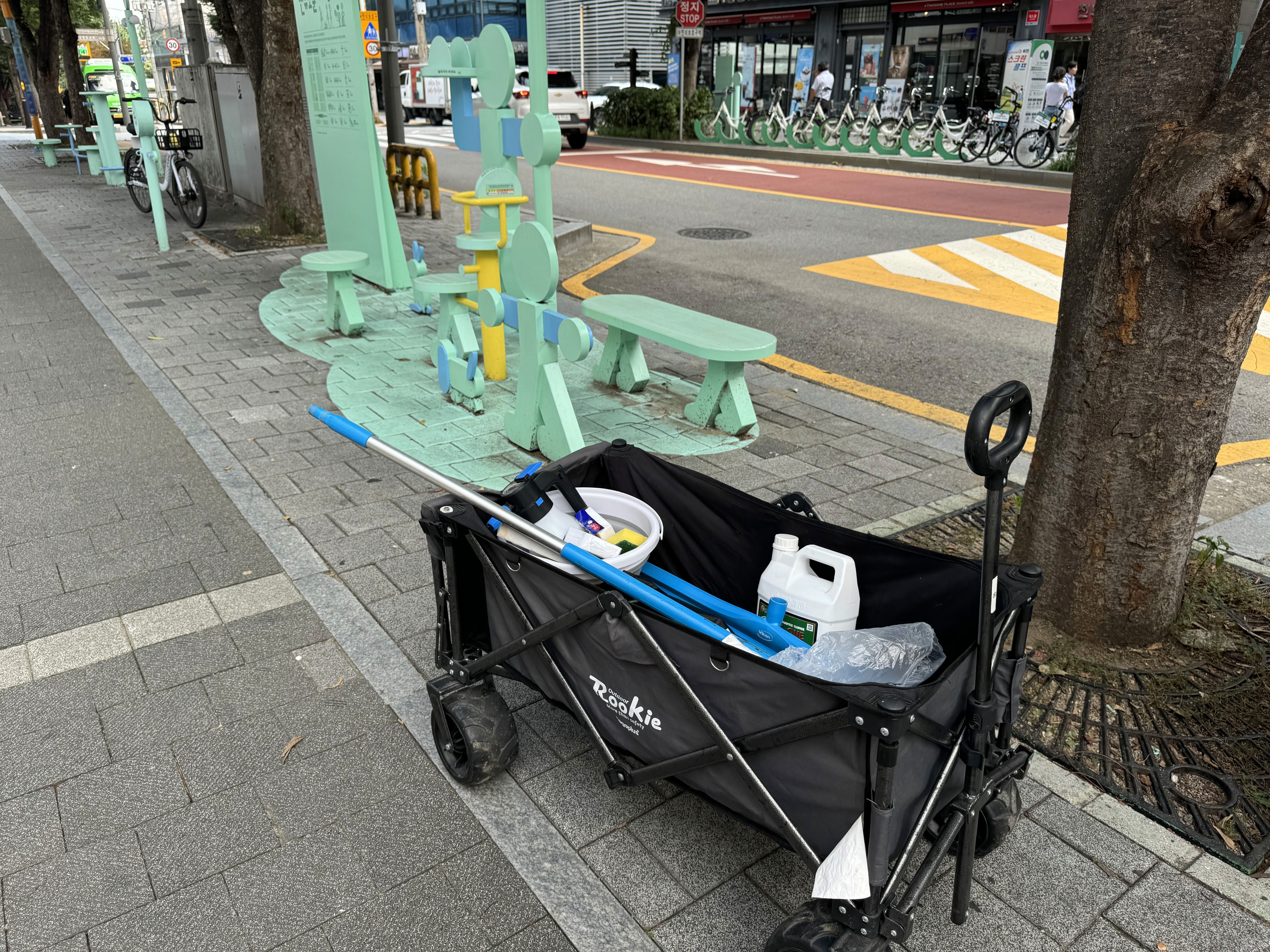 청소 전에 조형물 주변의 장애물을 제거하고, 바닥에 방수포를 깔거나 물탱크를 준비하는 등 필요한 준비 작업을 수행합니다.